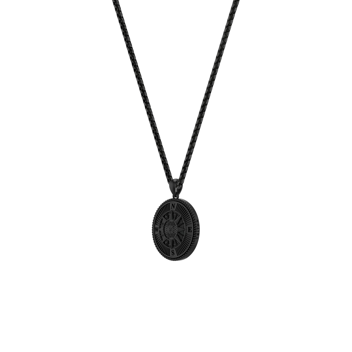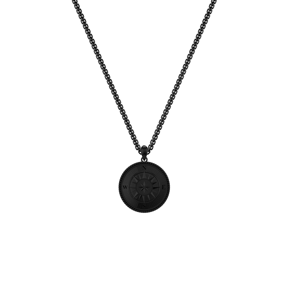 24" sterling silver necklace features a 27MM compass pendant finished in black ruthenium on a matching box chain. A sleek, directional symbol of purpose and style—designed for bold self-expression and modern layering.