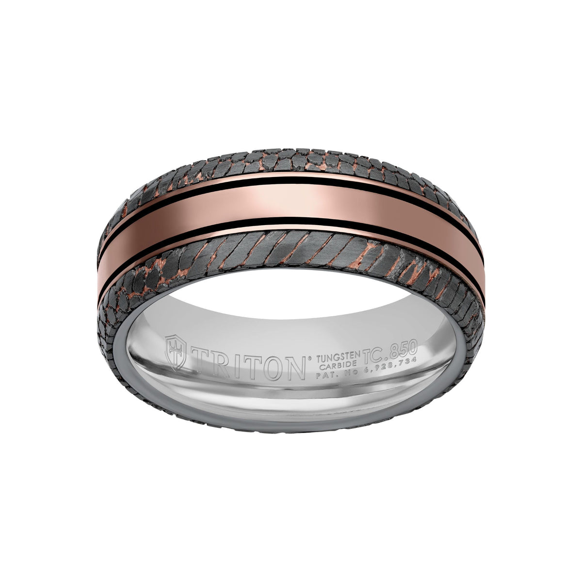 Triton’s Tungsten Carbide TC.850™ material is a uniquely forged metal that is perfect for a man’s active lifestyle. It’s durable, scratch-resistant and will maintain its finish over time with normal use. Triton’s Tungsten Carbide TC.850™ is a patented formula consisting of approximately 85% Tungsten Carbide, yielding a strong, heavyweight, hypoallergenic and tarnish resistant material.