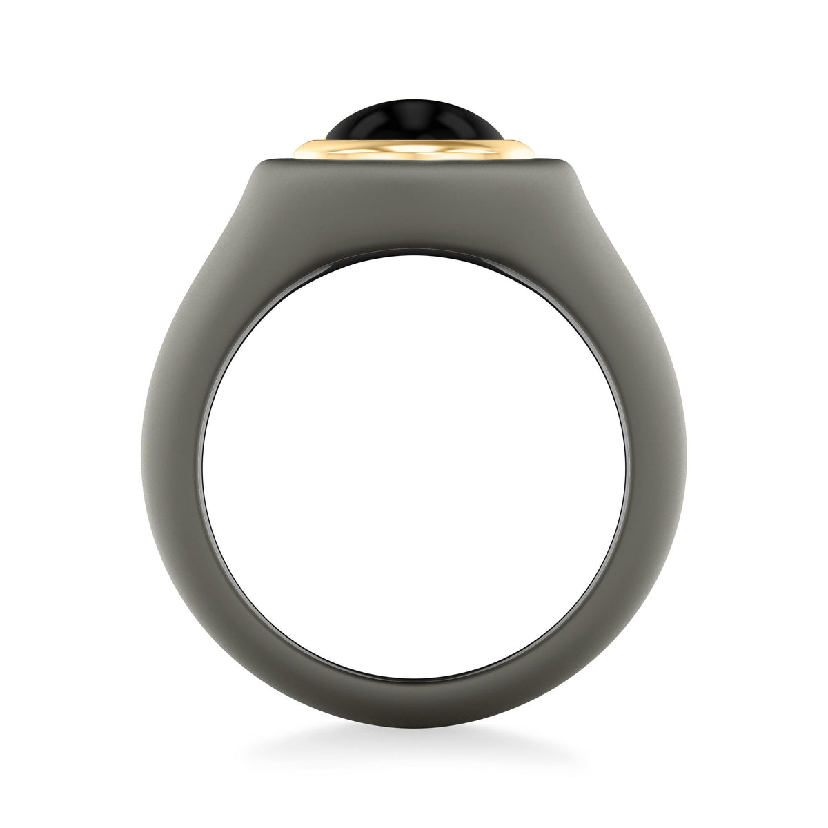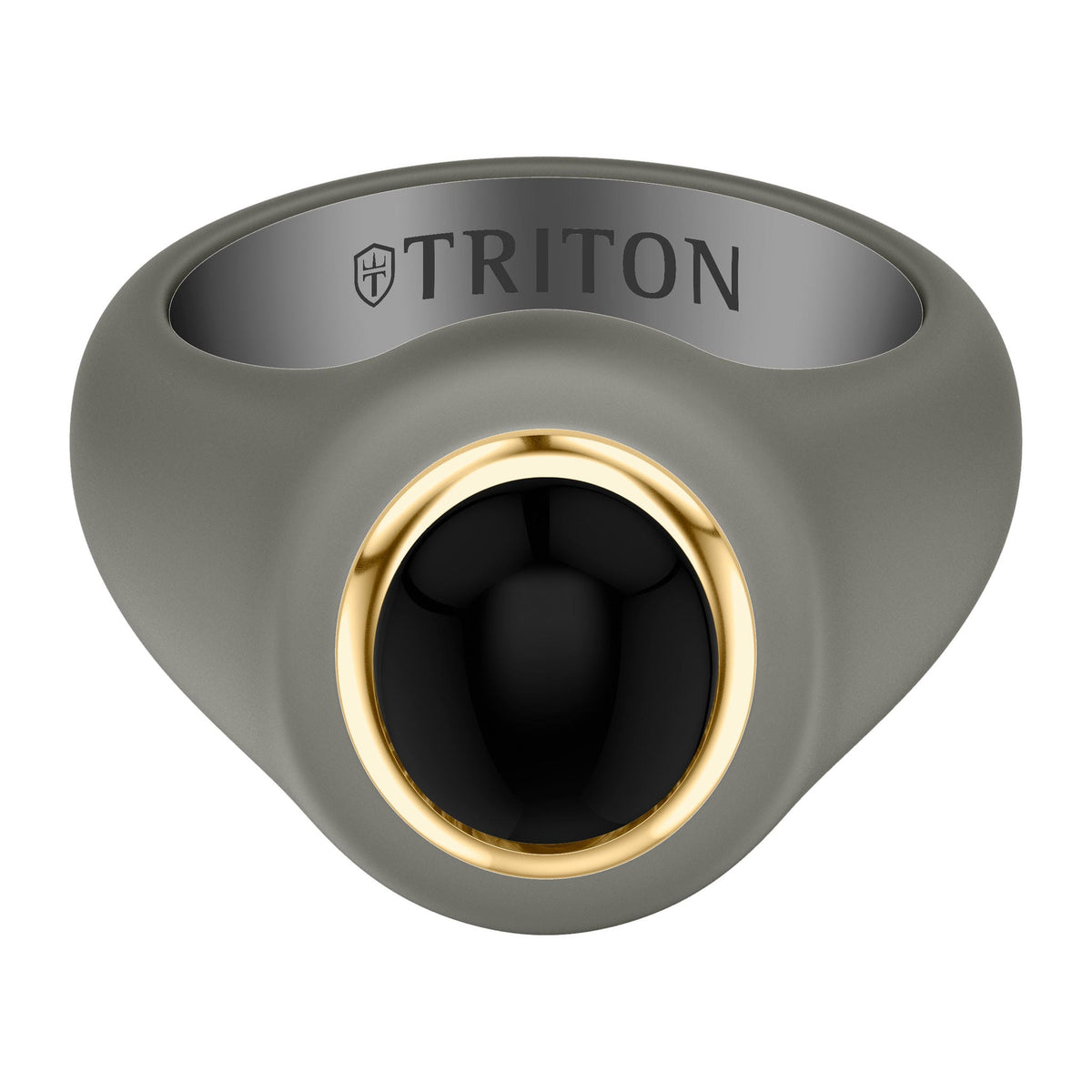 This titanium signet ring features a bezel-set oval black onyx center framed in yellow gold plating. With a sandblasted finish for added texture, it balances strength, sophistication, and bold contrast in one sleek, modern design. Available in Size 9, 10, 11The Triton Forever Fit Warranty™ celebrates the nature of change by offering a lifetime size exchange program to honor your evolution.